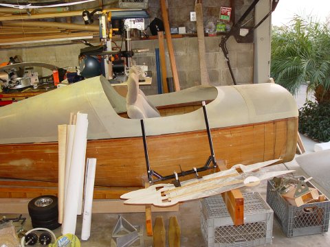 Here is a picture of the back portion of the plane, The rudder is built and is behind the unfinished vertical stabilizer, elevator laying ontop of the horizontal stabilizer with Dr. Dean HInges on elevator. Also you can see the main spars and the aft spars all done already.