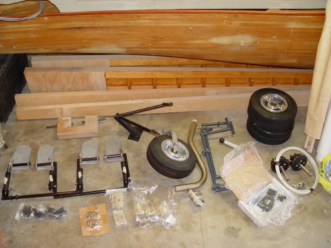 Here is a pile of parts that goes with it. Custom made dual pedals with master cylinders on all pedals. Diehl front nose wheel assembly and old set of dual pedals, Allen electric trim kit. Tracy Obrien brakes, axles, tires and brake line and fittings. Another shot of the spars