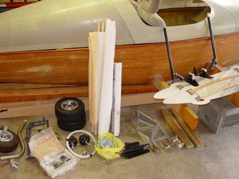 It comes with KR2S Rand Prepreg parts Gas Tank, nose cover, canopy shroud and turtle deck, Also visible wing templates, Dual control Sticks Langford Style, 2 Honda seats, a crate of salvaged parts (in front of the plane)