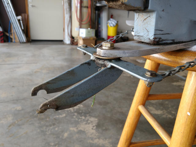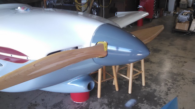 I spoke with Ed Sterba and he said I could trim 1/2" off each prop tip and reduce the 54x54 prop to a 53x54. That was easy enough using a "Japanese pull saw" and feathered the cuts with sandpaper. I used a lawnmower blade balancer to check and adjust the balance successfully. I left the bent spinner on the workbench.