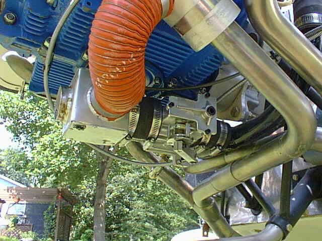 Here's the rub; I'm dissatified with the default Revmaster Revflow carb mount. There is no fixed mounting to attach the carb to the engine. The carb is connected by a section of 38mm rubber tubing clamped to the carb body and the intake induction manifold.