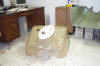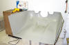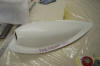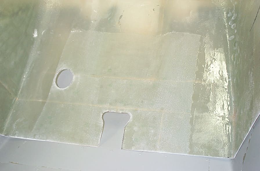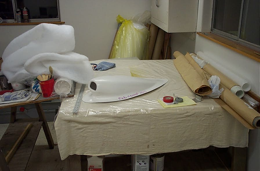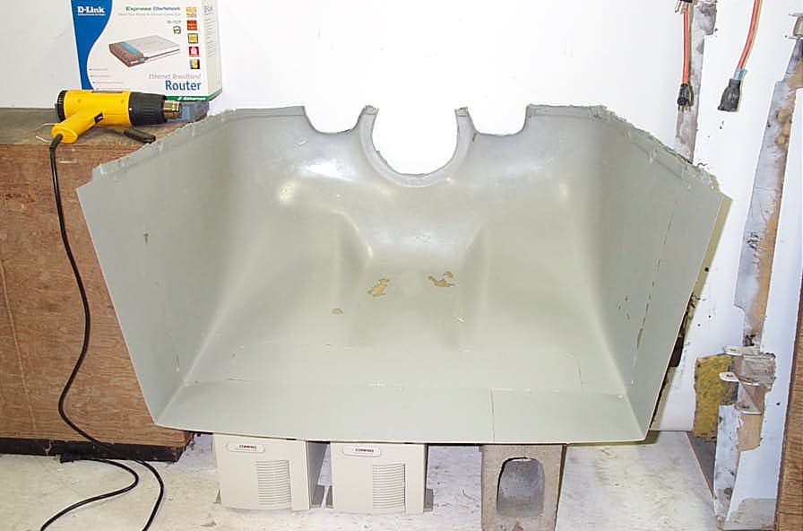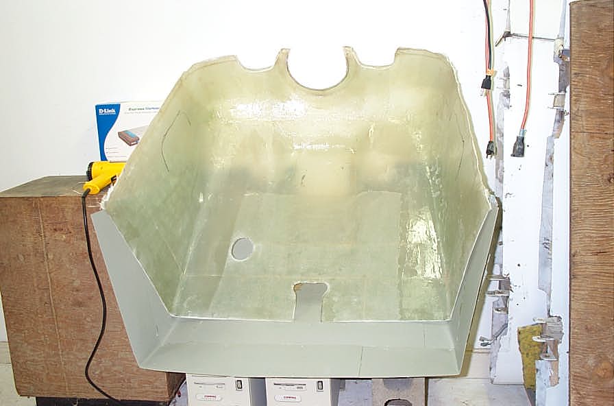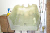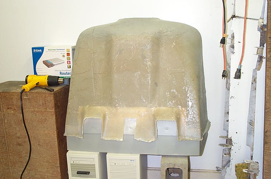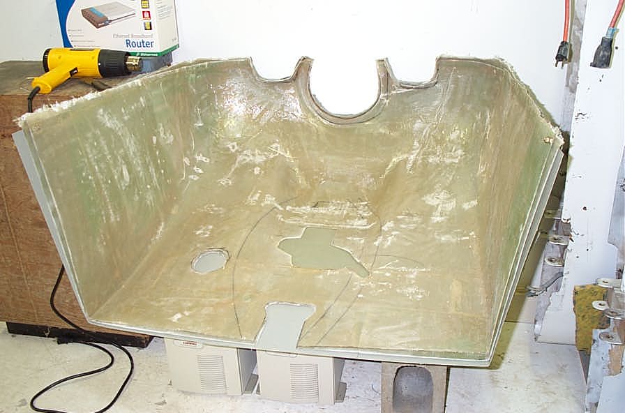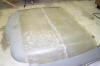Now that I had a mold, I cut glass and fit everything dry, marking the layers as I went. The lower surface and vertical sides were cut as single pieces of glass cloth. I overlapped the corners by about 2" for more strength. I used 2 layers of cloth. The areas around the air inlets required some fancy cutting. I bought 1", 1.5" and 2" fiberglass tapes to help build areas where there are complex curves. This worked well when sandwiched in between larger pieces of glass cloth.