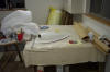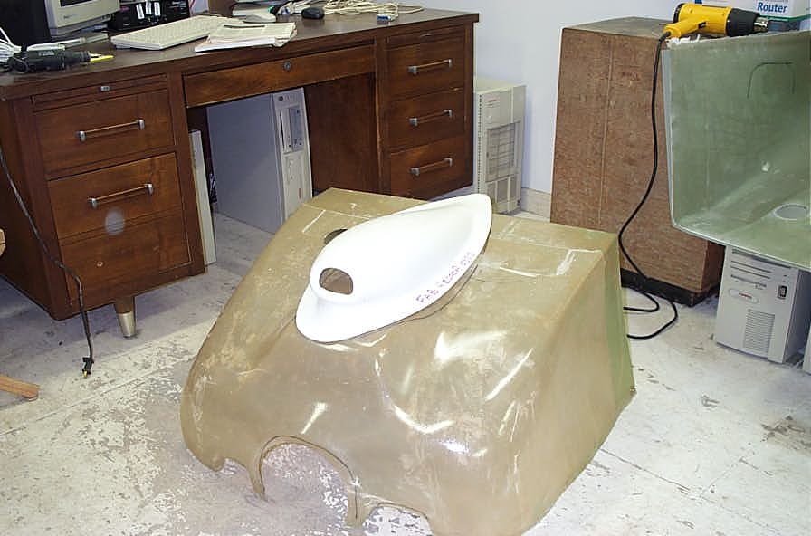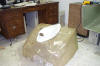 Anyhow, I brushed the resin completely into the mold and started laying in the precut glass cloth. I'm installing a tri-gear so I put on a 3rd layer to reinforce the bottom surface. Then you wait to pop it out of the mold. You know the rest, "trim to fit."