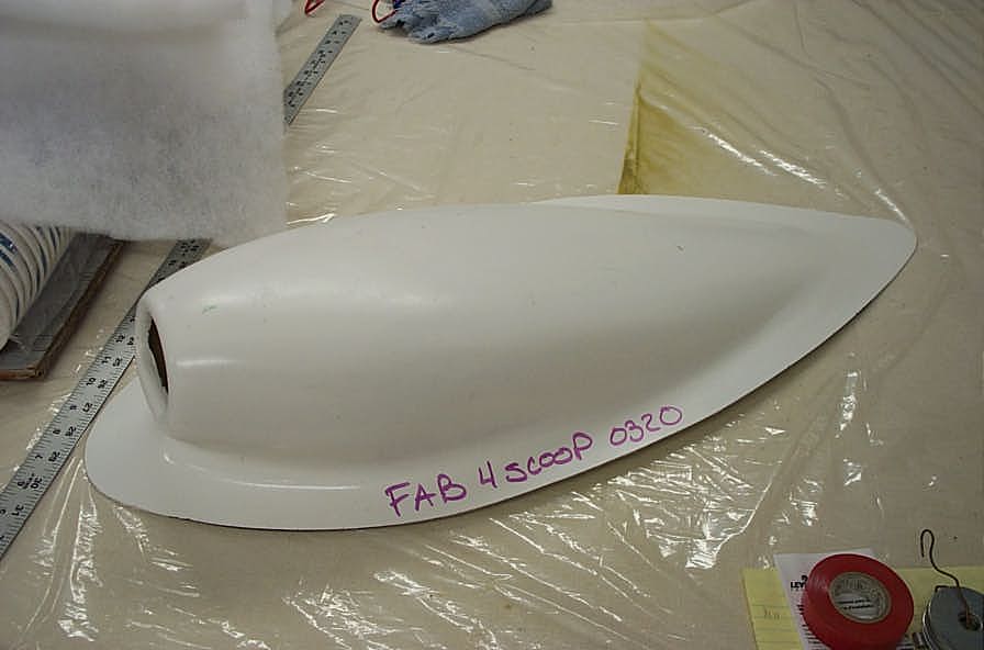 One cool thing about having your own mold is can use the first part you build as a fitting template. I hacked it up pretty well to determine where the Revflo injector would go and the nose gear brackets. Once I had that figured out, I built another cowl. Experience paid off for me as the second part was much better in quality and actually lighter to boot. The whole thing without fasteners is about 4 1/2 pounds, maybe less.